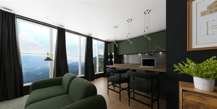 Ce studio a été pensé dans une harmonie de matières naturelles et de teintes profondes. La cuisine et le séjour se fondent dans une même ambiance chaleureuse, où le bois contraste subtilement avec les murs sombres. En fond, un coin nuit discret et raffiné structure l’espace. La salle de bain, dans le même esprit, joue la carte du minimalisme sobre. Un projet compact, mais pleinement optimisé, pour un style de vie urbain et élégant.